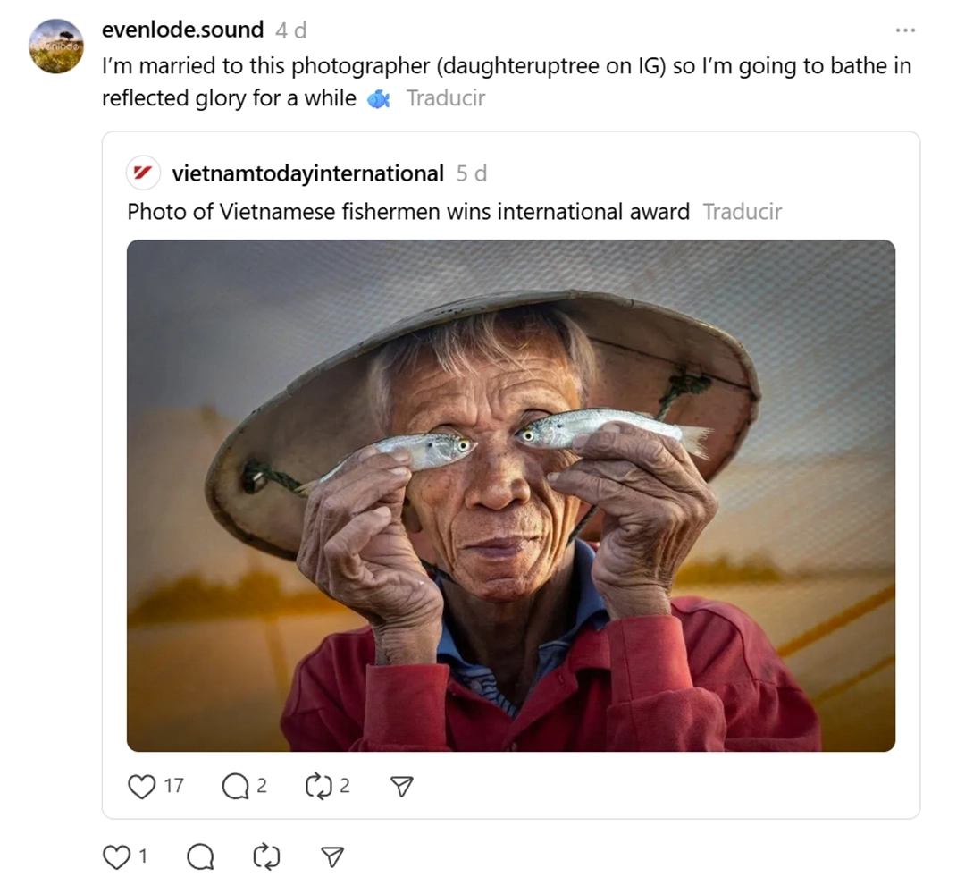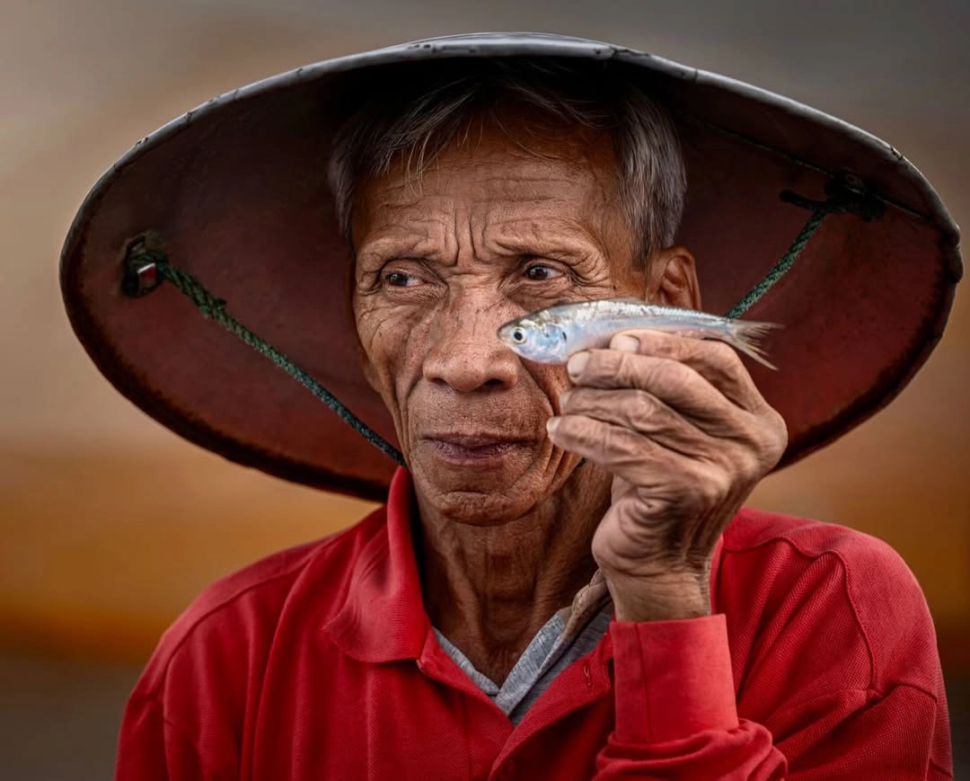 Tran Trong Khai, a photographer from Ho Chi Minh City, stated that the person in the photograph is Mr. Muoi, a local fisherman. He specializes —indeed, makes a living from— recreating scenes of net retrieval, wearing a reddish-orange shirt, for photography tours. He has performed the same gesture —holding a fish up to his eyes— thousands of times for numerous groups of photographers. Khai himself has photographed Mr. Muoi on two occasions, most recently in 2023. However, lacking the appropriate lens, he was only able to capture net-retrieval scenes, not portraits. No prizes. No recognition.