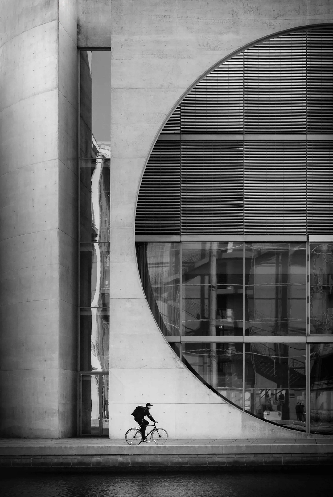 Below, beside the water, a cyclist cuts across the scene. It is a minimal figure, dark and solitary. It occupies barely a fraction of the frame, yet it gives the image its precise dose of vital substance. Its presence introduces the proper scale to the photograph and allows the building’s monumentality to be measured.