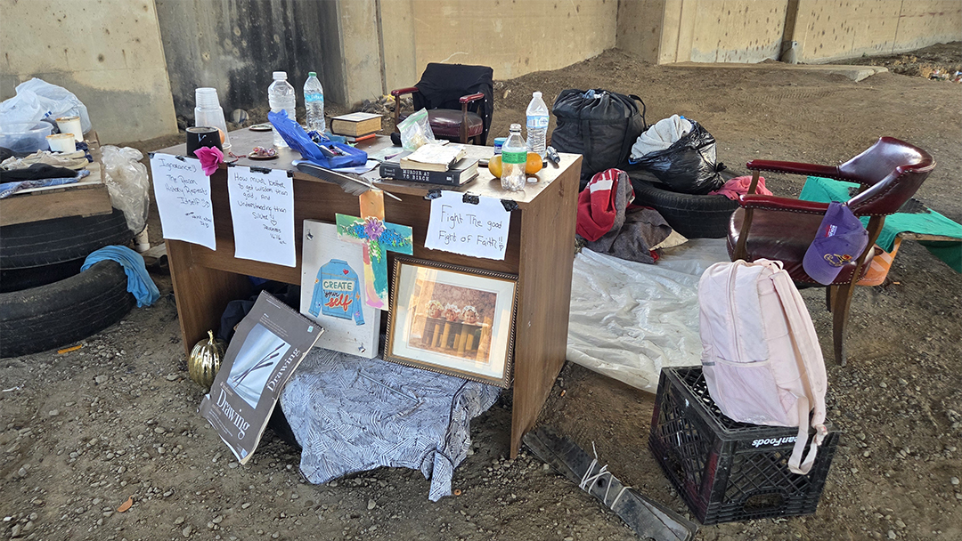 Justo al pie de uno de los muros que separan la avenida de la orilla y bajo el puente de la autopista, vive una persona. No estaba cuando llegamos, por lo que pude observar su espacio detenidamente. Me llamó la atención que, entre el desorden, aparecían por todas partes gestos estéticos, conceptuales y hasta filosóficos. Me pregunto si el acomodo que fuerza la precariedad posee la misma belleza que nace de los condicionantes universales de la física, de las propiedades intrínsecas de la materia.