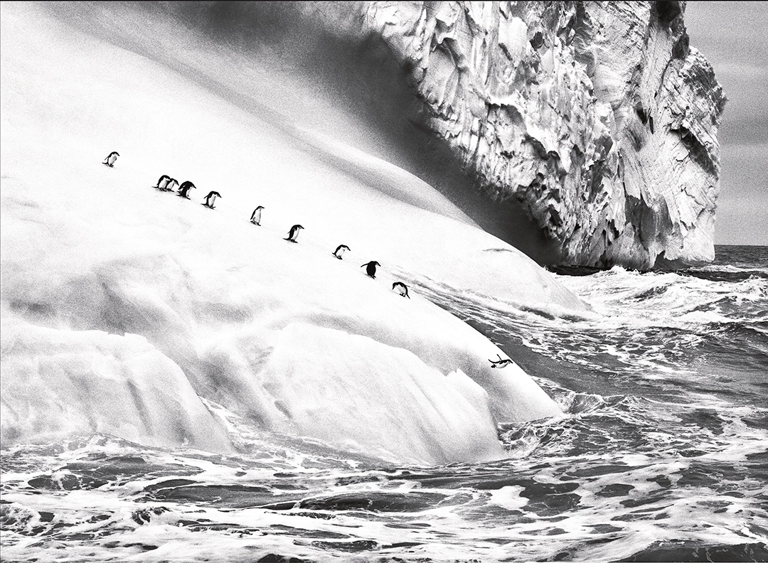 Glaciers—published after Salgado’s death last year—brings together 65 black-and-white photographs of glaciers and other icebound landscapes made for Genesis. They are timeless images: frozen film-frames of the ice’s large and small movements in the coldest regions. One of the most stirring photographs shows a procession of penguins hurling themselves into the sea from an iceberg in the South Sandwich Islands in 2009.
