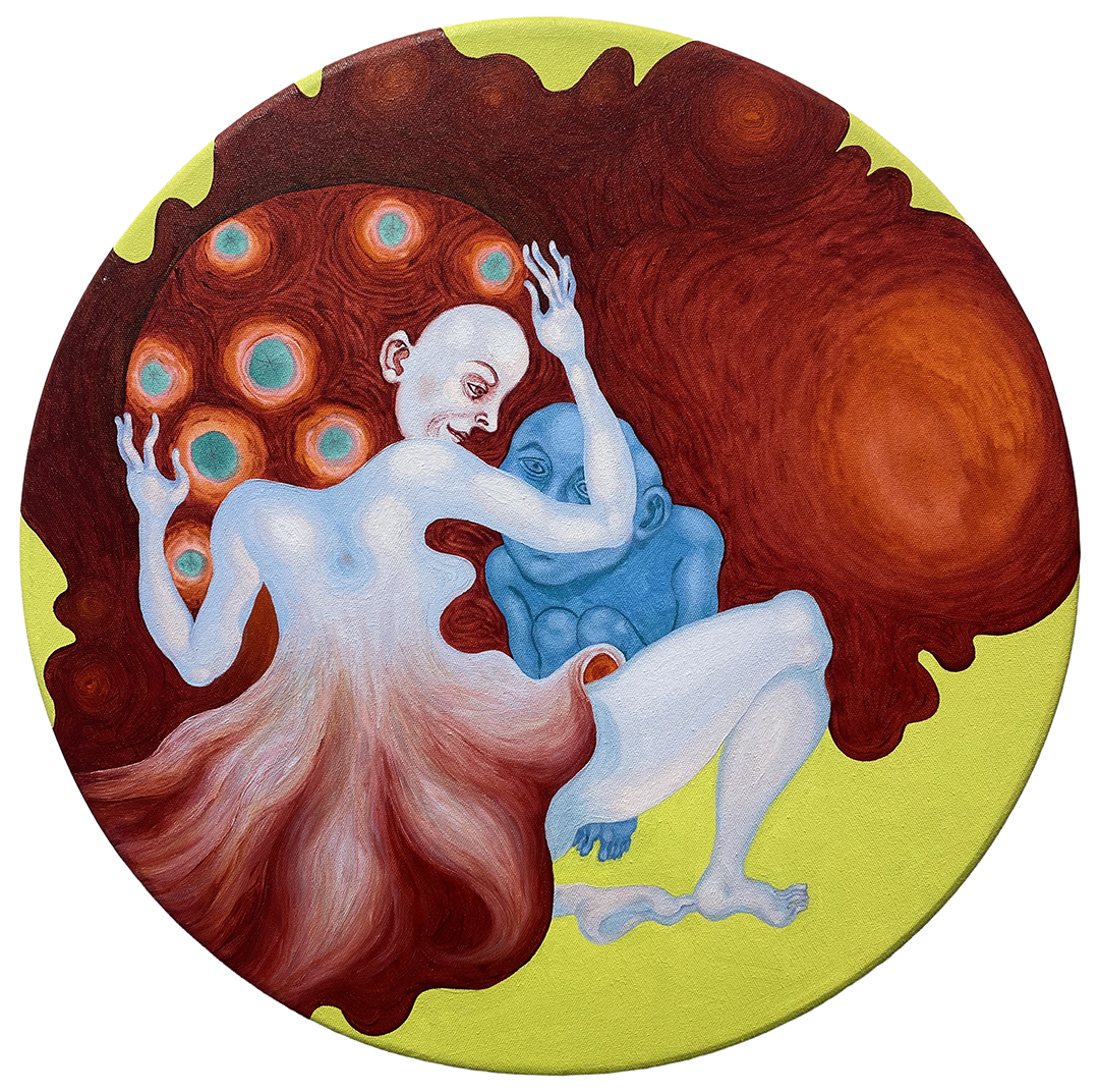 Esta figura femenina, de contornos fluidos, se expandirse como una sustancia viva para envolver o absorbe al cuerpo azul y recatado. Una masa orgánica, casi visceral, se despliega como fondo activo, punteado por formas oculares que introducen una dimensión de vigilancia. Es una escena que no fija un instante narrativo concreto, sino un proceso continuo de asimilación, donde lo circular refuerza lo cíclico, en términos de condena y repetición.