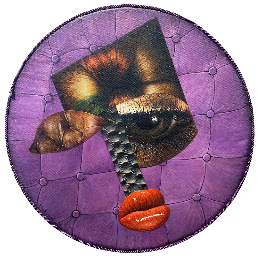 Aldo Menéndez propone una relación tensa entre continente y fragmentación. El soporte, acolchado y casi doméstico, nos sugiere una superficie blanda, íntima, incluso táctil, pero esa promesa es interrumpida por la irrupción de un rostro ensamblado a partir de fragmentos dispares. Aunque el ojo —húmedo, vigilante— actúa como eje perceptual, no logra ni intenta estabilizar el conjunto. La boca, protagónica absoluta, roja e hinchada, saturada y autónoma, parece pertenecer a otro rango de sentido.