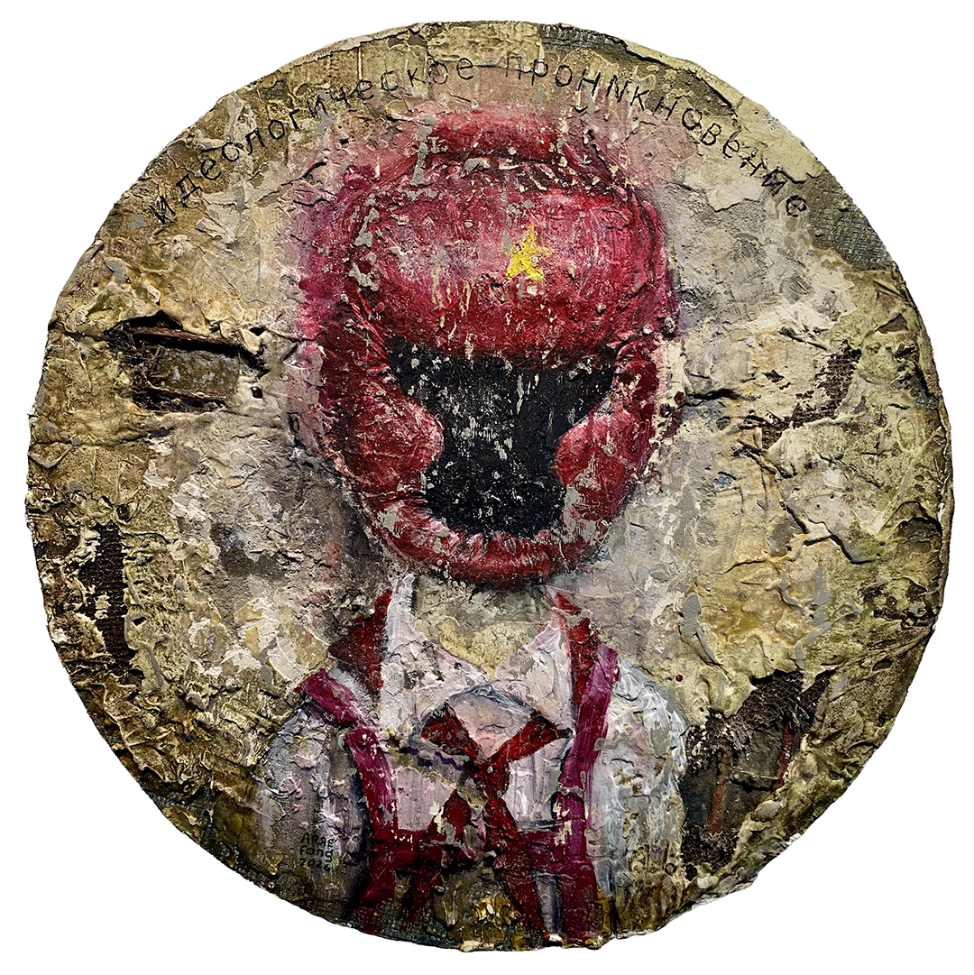 En la obra de Arrechea, la figuración nos dirige a un juicio histórico. La superficie, erosionada y densa, parece cargada de demasiadas experiencias contaminantes, como si su autor hubiera sido sometido a procesos de desgaste, acumulación y violencia. Más hacia el centro, la figura —la deformada cabeza de una pionera, completamente anulada— introduce la dimensión política que se hace explícita y ostentosa con la presencia de escritura eslava en el perímetro. El círculo recuerda a un objeto votivo o un relicario. Su imagen es frontal e inevitable. Nos habla de la anulación del individuo, de su castigo.