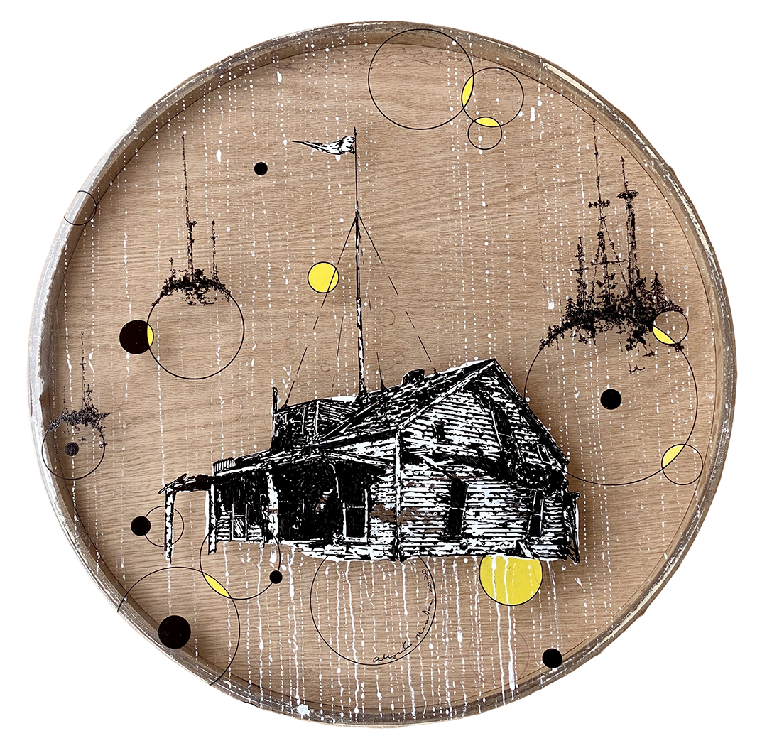 Mendoza, por su parte, desplaza la tensión hacia una poética suspendida. Sobre una superficie de madera, cercana a una bandeja o un objeto funcional, inscribe una arquitectura precaria, casi fantasmagórica. La casa parece sostenerse en un improbable equilibrio, rodeada por formas circulares que la orbitan, como sistemas autónomos que activan el espacio y los fragmentan en varios focos de atención. De todas estas piezas es la que más insiste en la inasibilidad del círculo, la única que en realidad la comenta.