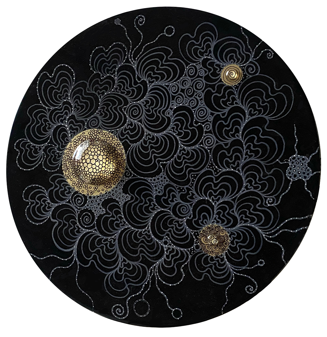 Por último, quiero destacar la que, a mi juicio, aprovecha mejor el formato. Esta pieza de Luisa Mesa me llena de paz. Lo circular funciona como una apertura que nos permite asomarnos a un mundo a la vez micro y macroscópico. Ese fondo adimensional se revela cubierto por una red de líneas sinuosas, casi respiratorias, que se expanden en patrones similares a formaciones celulares. Son líneas trazadas con una precisión casi obsesiva, que sostienen, en un segundo plano, tres elementos dorados, como cuerpos celestes de un universo inhumano que, curiosamente, evitan el centro. Esta pieza, un minuto más tarde, podría ser otra; una nueva cada hora, como ocurre en el plano donde lo orgánico crece y se organiza como un ornamento que se parece mucho a la vida misma.