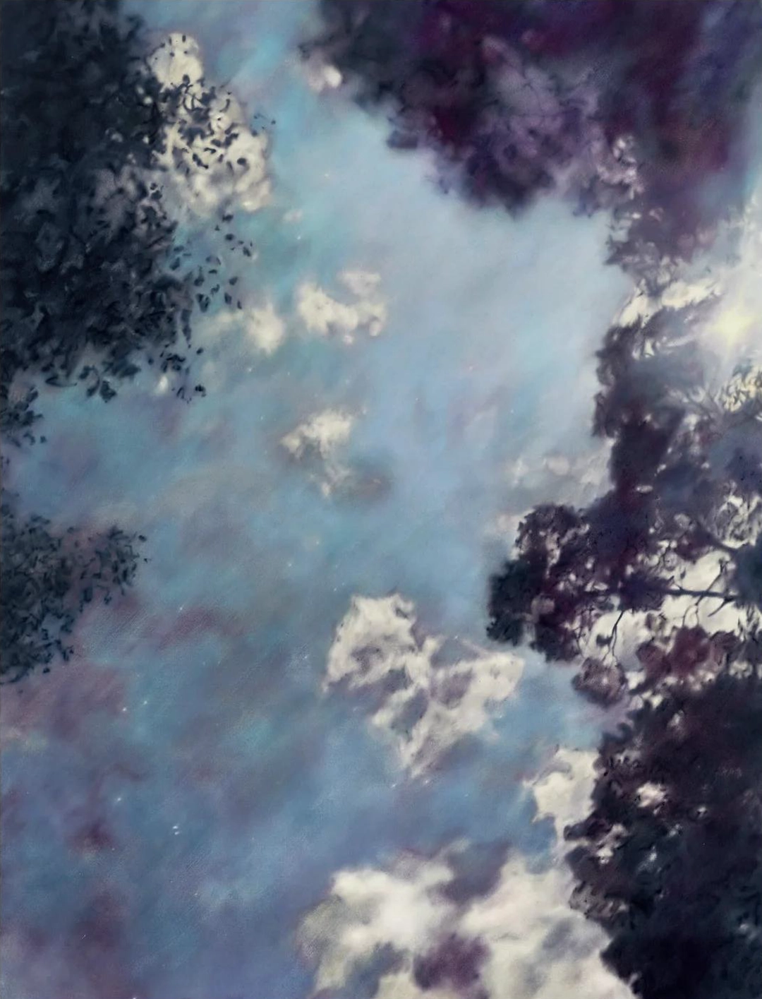 He felt, then, an immediate connection with the rest of the planet’s spellbound: “we are all under that light.” And, setting to work, he produced a series of oil paintings—muted, cautious—so as not to stray too far from the purely contemplative instant. In one canvas, night rain falls out of focus across a car windshield; in another, the setting sun yields the stage to a moon reflected on the trembling surface of an inscrutable body of water.