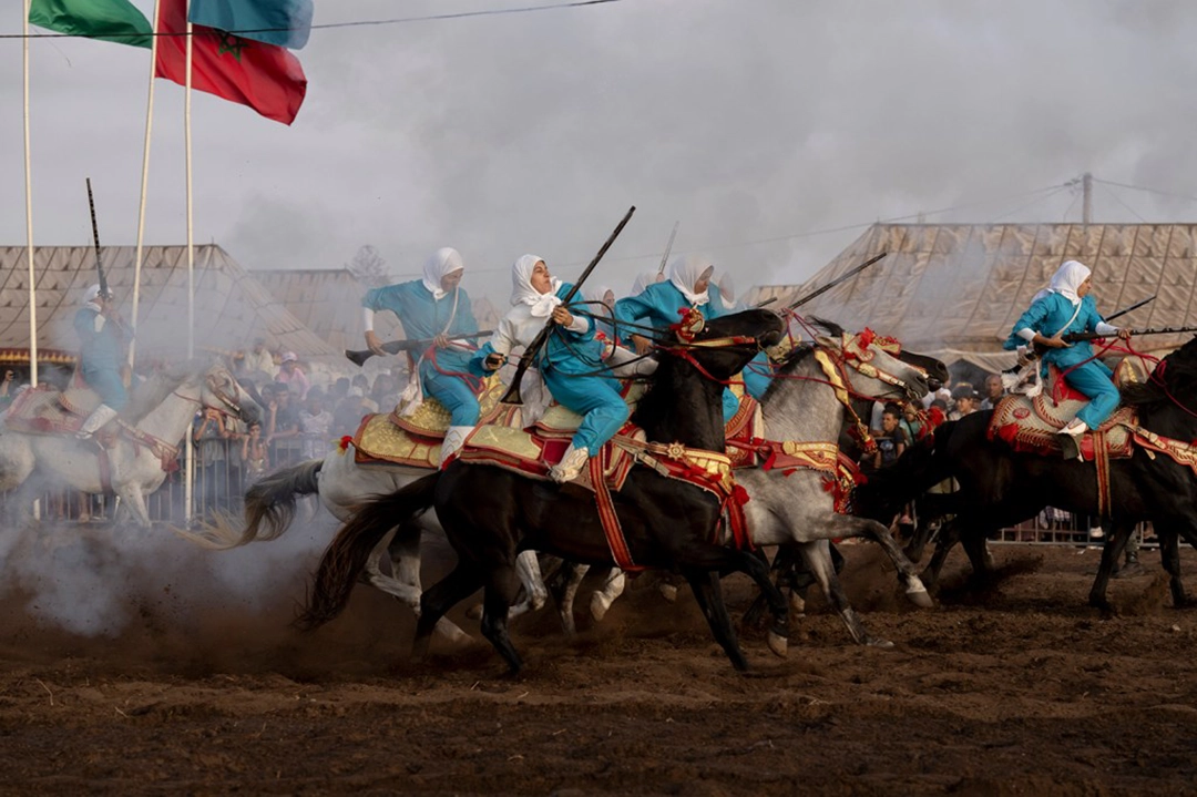 Noura attempts to control her horse after firing, the most dangerous part of the performance. Riders risk injury from gunpowder or falling and being trampled. Sidi Rahal, Morocco, 8 August 2025. Farīsāt: Gunpowder’s Daughters © Chantal Pinzi, Panos Pictures, Africa, Stories.