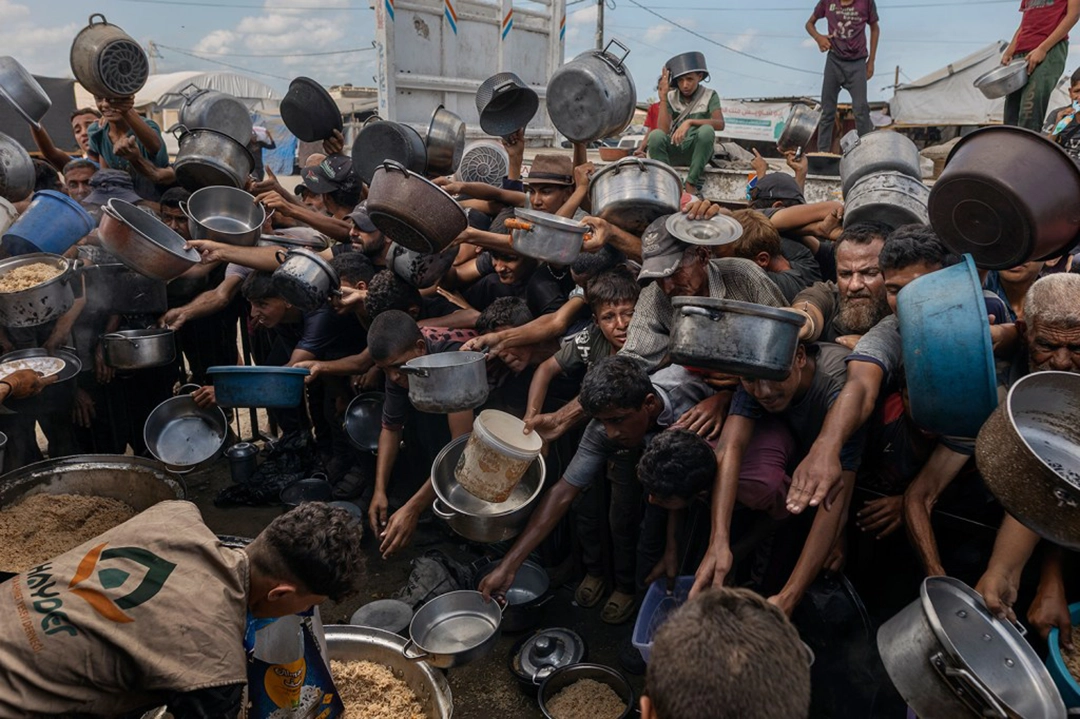 Palestinians at Al-Mawasi displacement camp wait for a meal. Local charity kitchens were one of the only food sources for many of Gaza’s displaced. Khan Younis, Gaza Strip, 21 September 2025. Witnessing Gaza © Saher Alghorra, for The New York Times, West, Central and South Asia, Stories.