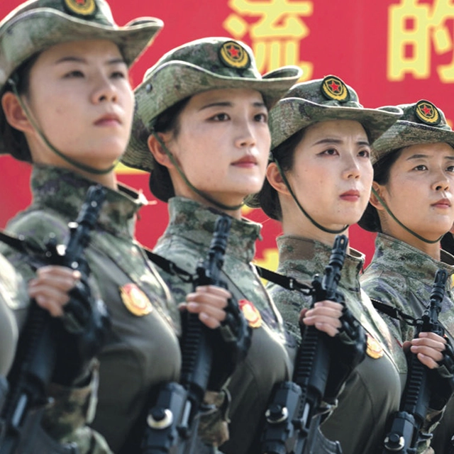 This image seized my attention at once. I suppose it was conceived—or chosen—precisely to provoke that effect on a massive scale. Within the advancing ranks of women soldiers of the People’s Liberation Army of China, one face stands out: the second from left to right. Is it mere chance?